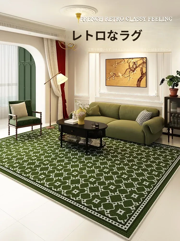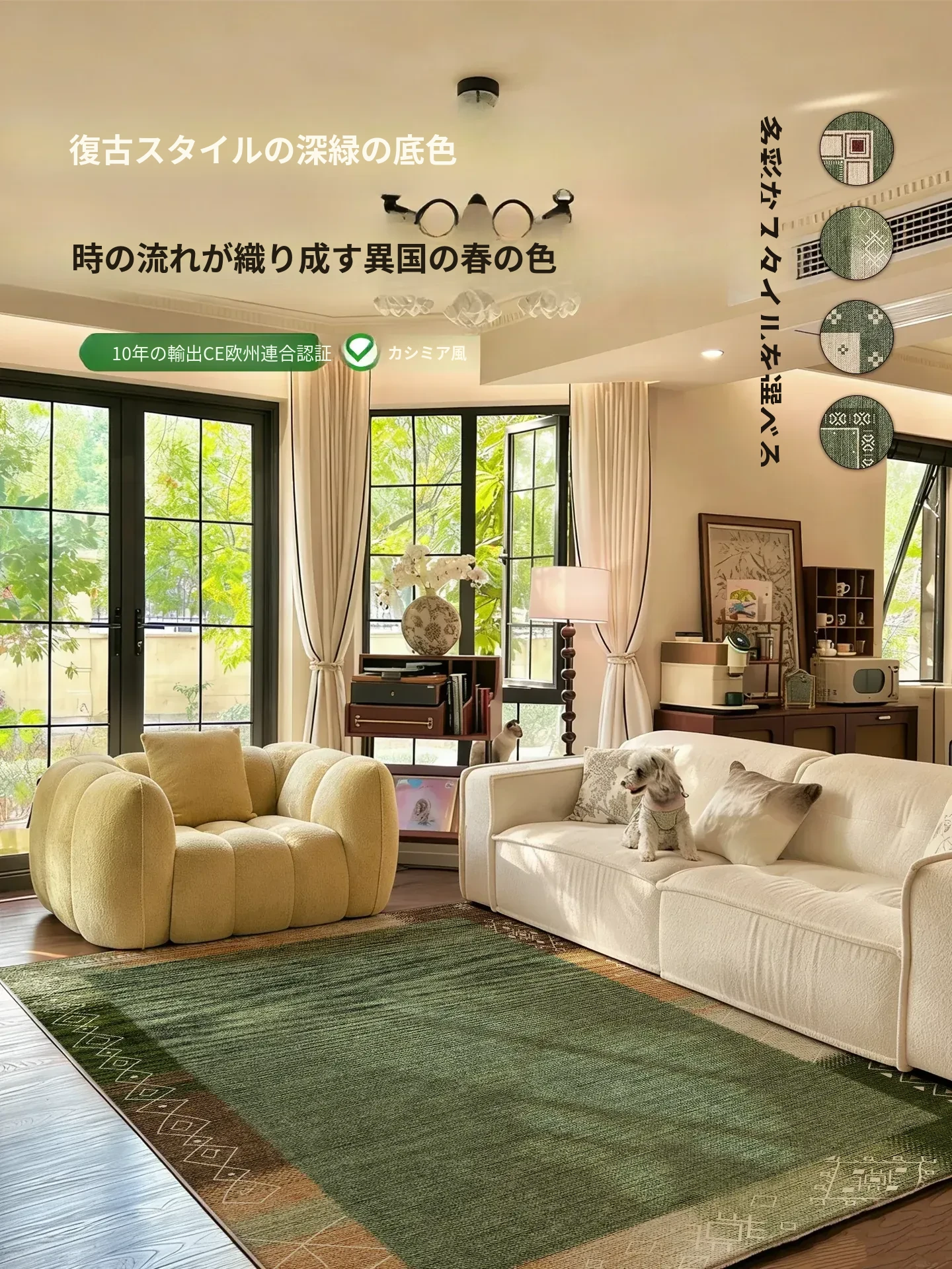 2025年新作!緑色の洗える2重構造カーペット - 中古風のリビングルームや寝室に最適なソファマットで、洗練された高級感を演出。