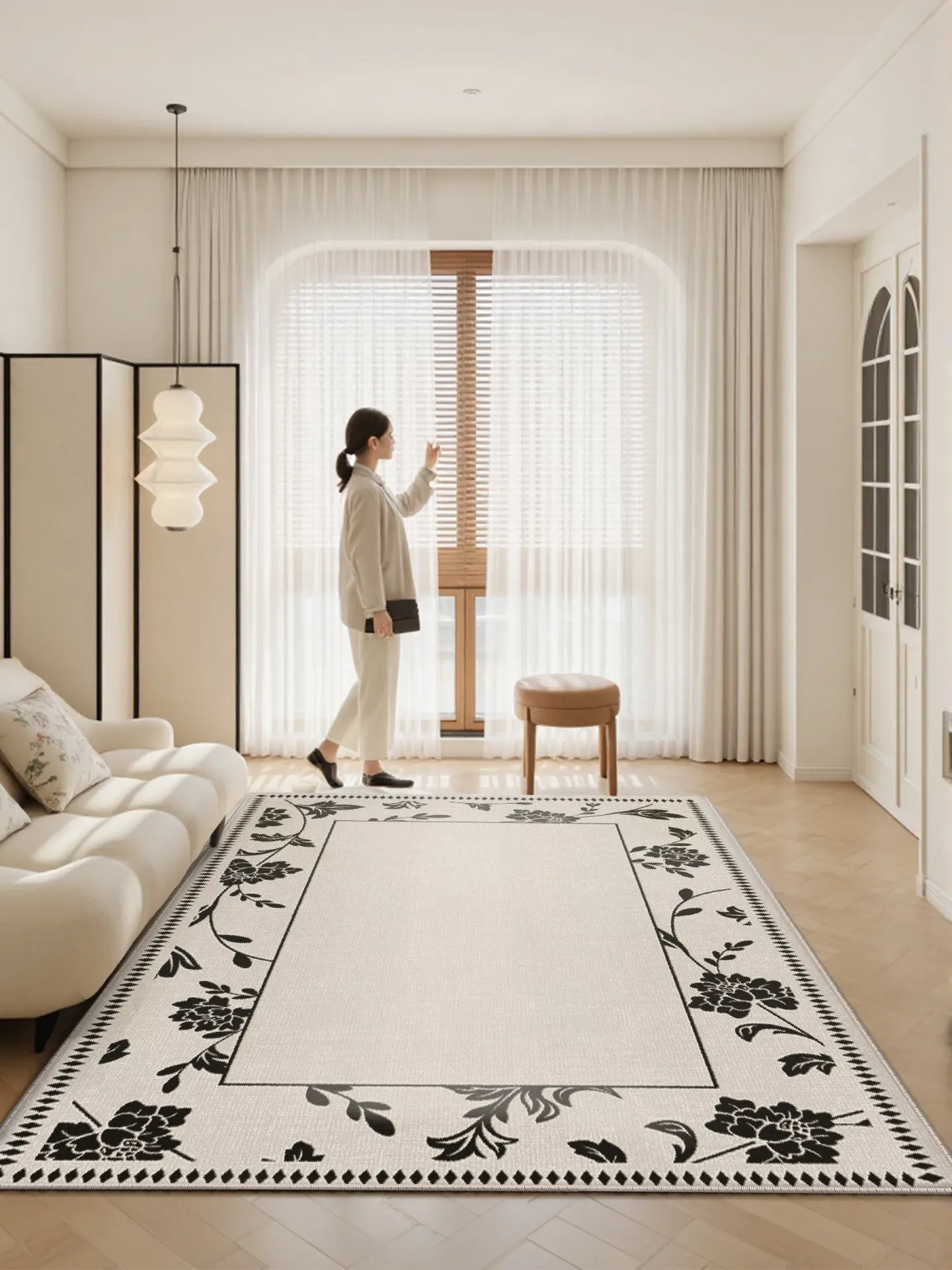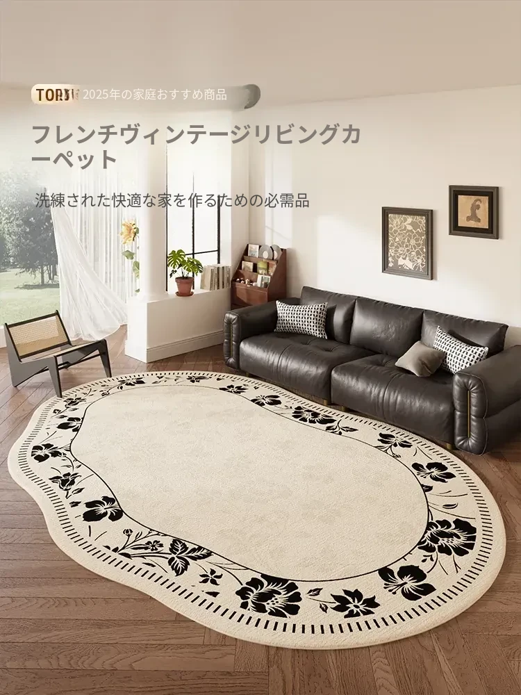 フレンチスタイルのユニークなデザイン!防水・防汚機能付きの高級感あふれる中古風カーペット。リビングや寝室にぴったりな2025年新作。ソファやテーブルの下に最適!