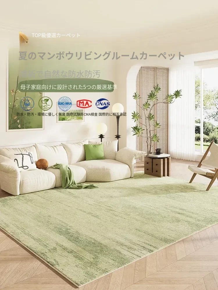 2025年新作!クリーム風の高級感あふれるグリーンカーペット。お手入れ不要で、拭き掃除も簡単!防水・防汚機能付きで、リビングにぴったりの軽やかなデザイン。シンプルでスタイリッシュな空間を演出します!