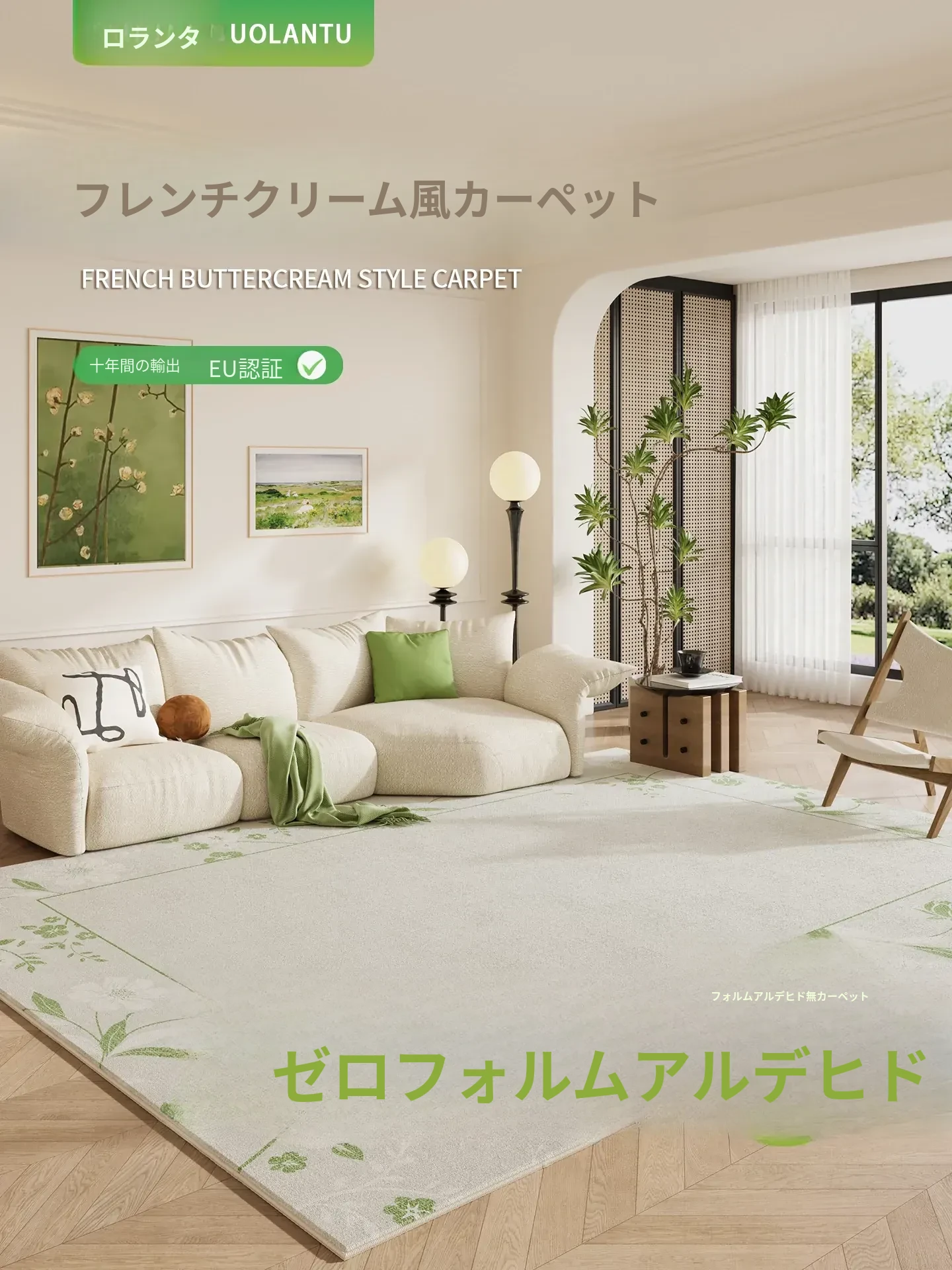 フランス風グリーンカーペット - リビングルームやベッドサイドに最適!クリーム色でおしゃれ、手間いらずのメンテナンス!新作ソファ用防水・防汚マットで、ティーテーブルの下にもぴったり!