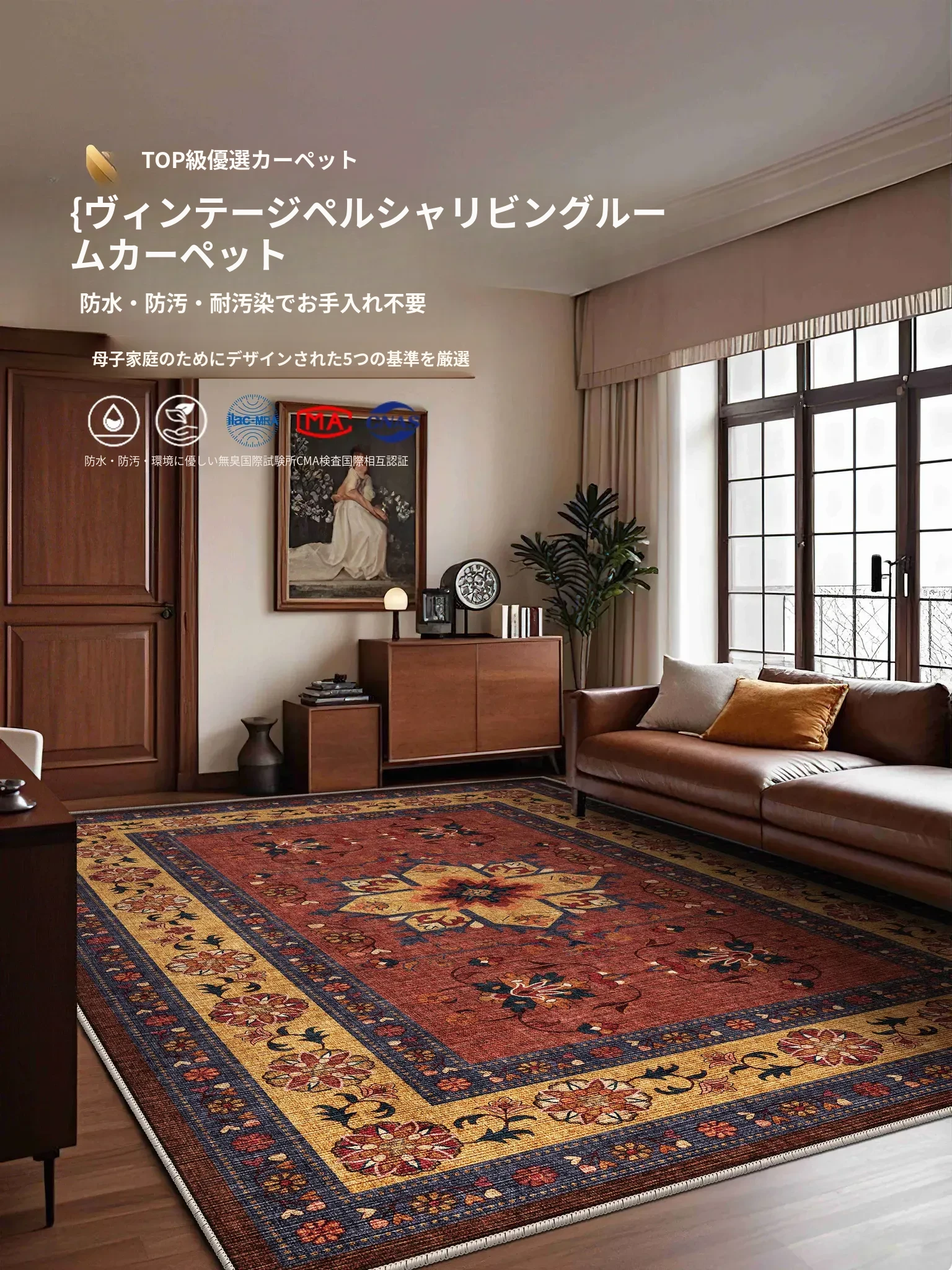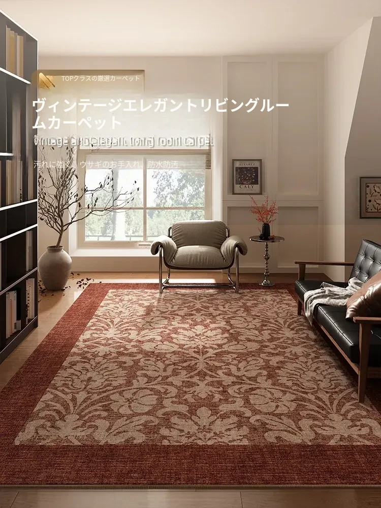 レトロスタイルのリビングカーペット、ペルシャソファにぴったり!高級感あふれるデザインで、寝室やリビングのアクセントに。防水・拭き取り可能でお手入れ簡単、忙しいあなたに最適です。