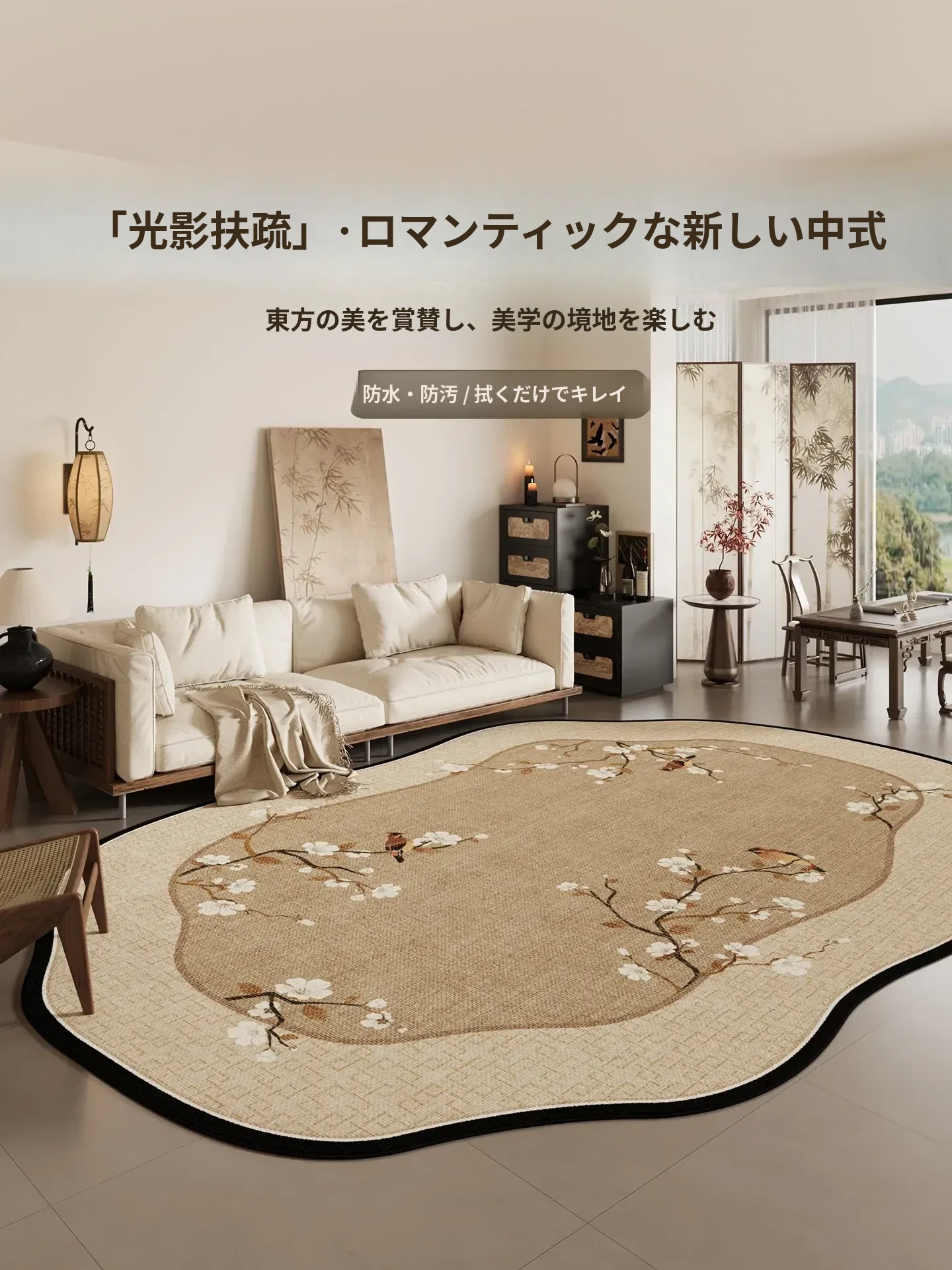 新中式デザインのラグ - リビングルームやベッドサイドに最適!お手入れ不要で防水、さらにはアイボリーの麻風仕上げでテーブルの下にもピッタリ。リラックスした空間を演出し、和の美を引き立てる一品です。