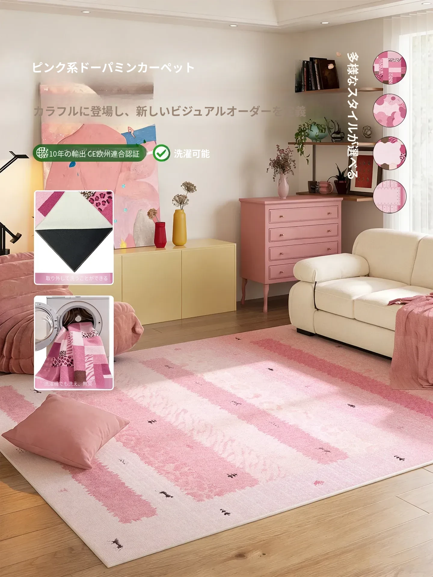 ドーパミンが感じられる洗えるカーペット!ピンクのバウハウスデザイン、2層構造で取り外し可能。リビングやベッドサイドにぴったりの機能的でスタイリッシュなマット。清掃も簡単で、毎日の生活をもっと楽しく!