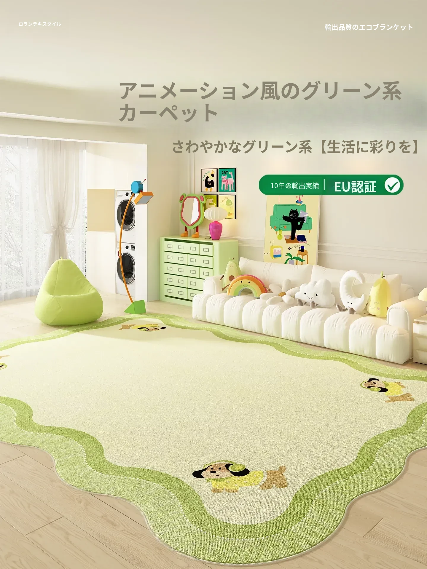 カートゥーンデザインのグリーンラグ!リビングのソファやテーブルにぴったり。防水・防汚でお手入れ簡単、厚手で快適な異形マット。おしゃれで機能的なアイテムで、あなたの部屋をもっと素敵に!