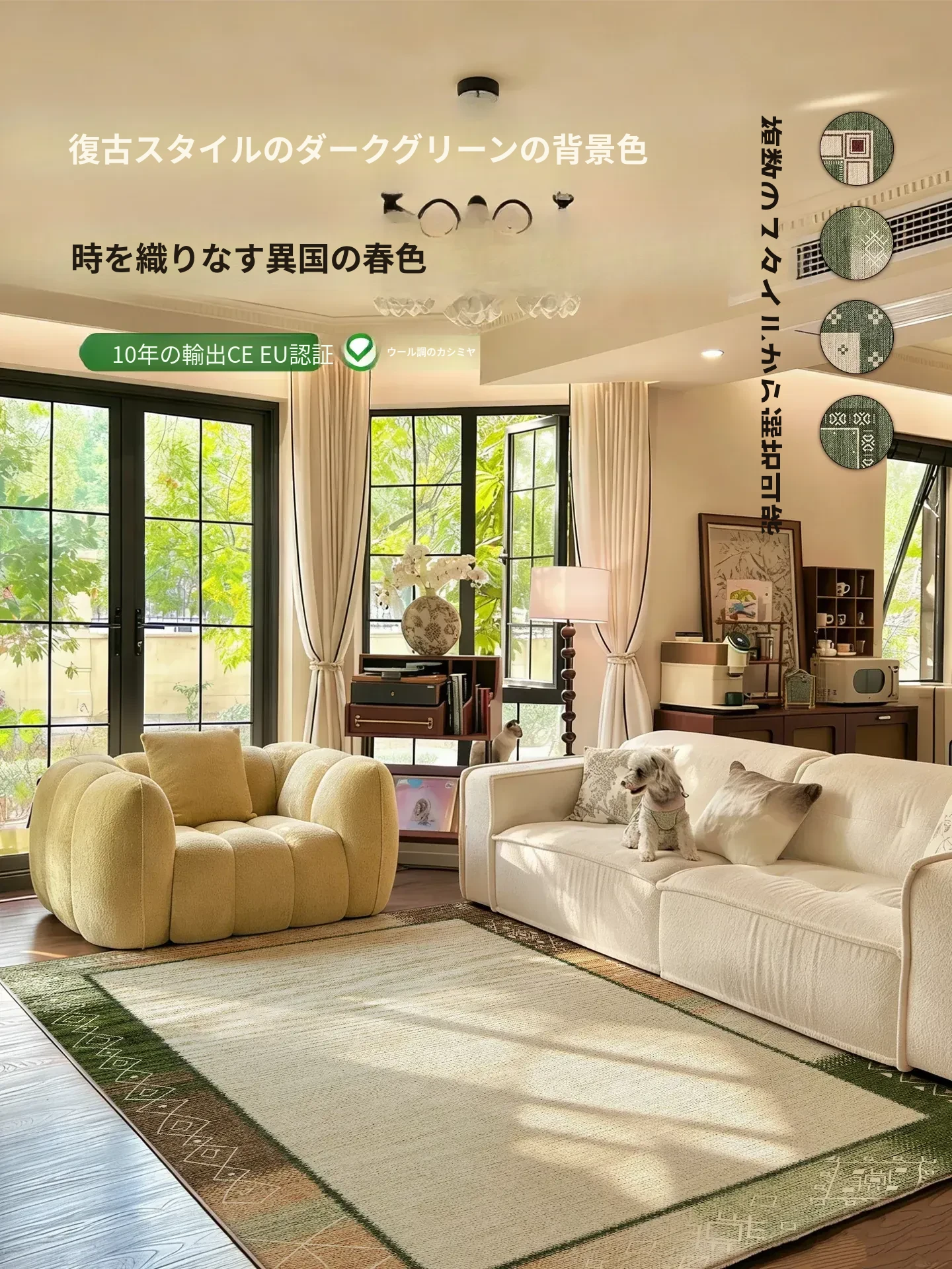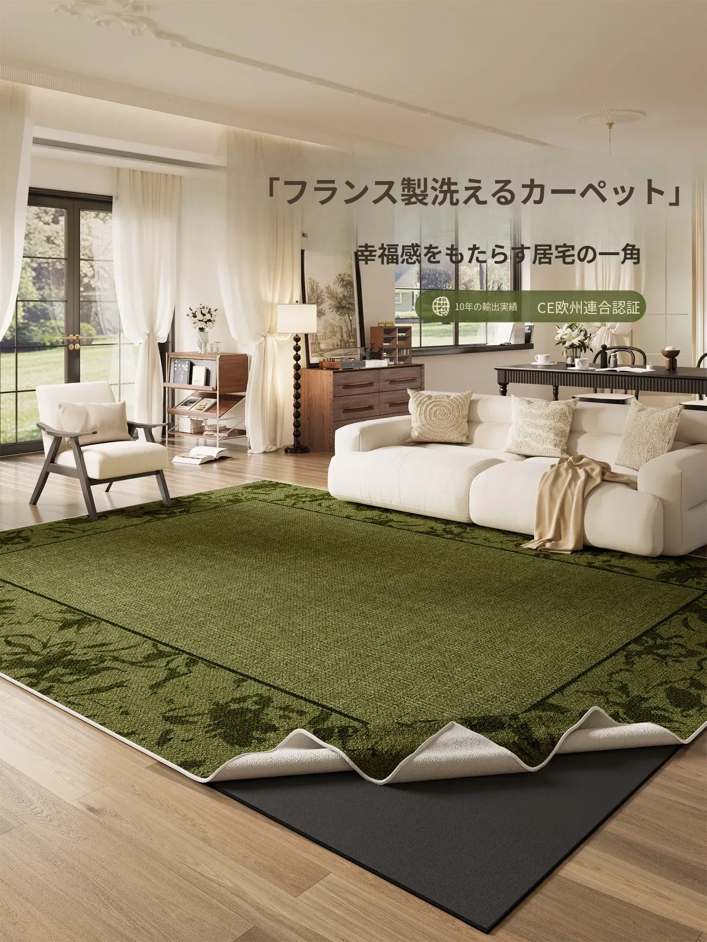 2025年新作!手間いらずのフレンチスタイル、洗える二重構造のグリーンヴィンテージラグ!リビングにぴったりな、簡単に取り外し可能でお手入れも楽々なカーペット。