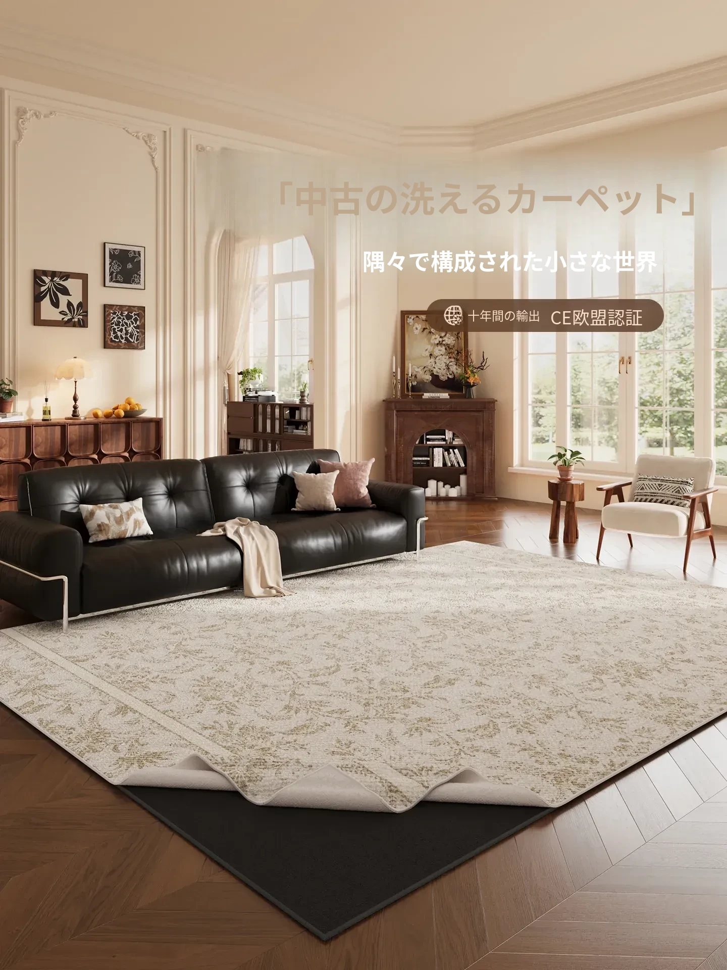 おしゃれなフレンチスタイルの高級感漂う取り外し可能なカーペット!リビングやベッドサイドにぴったりな中古風デザイン。お手入れ簡単なダブルレイヤーで、洗濯機で洗えるので安心!