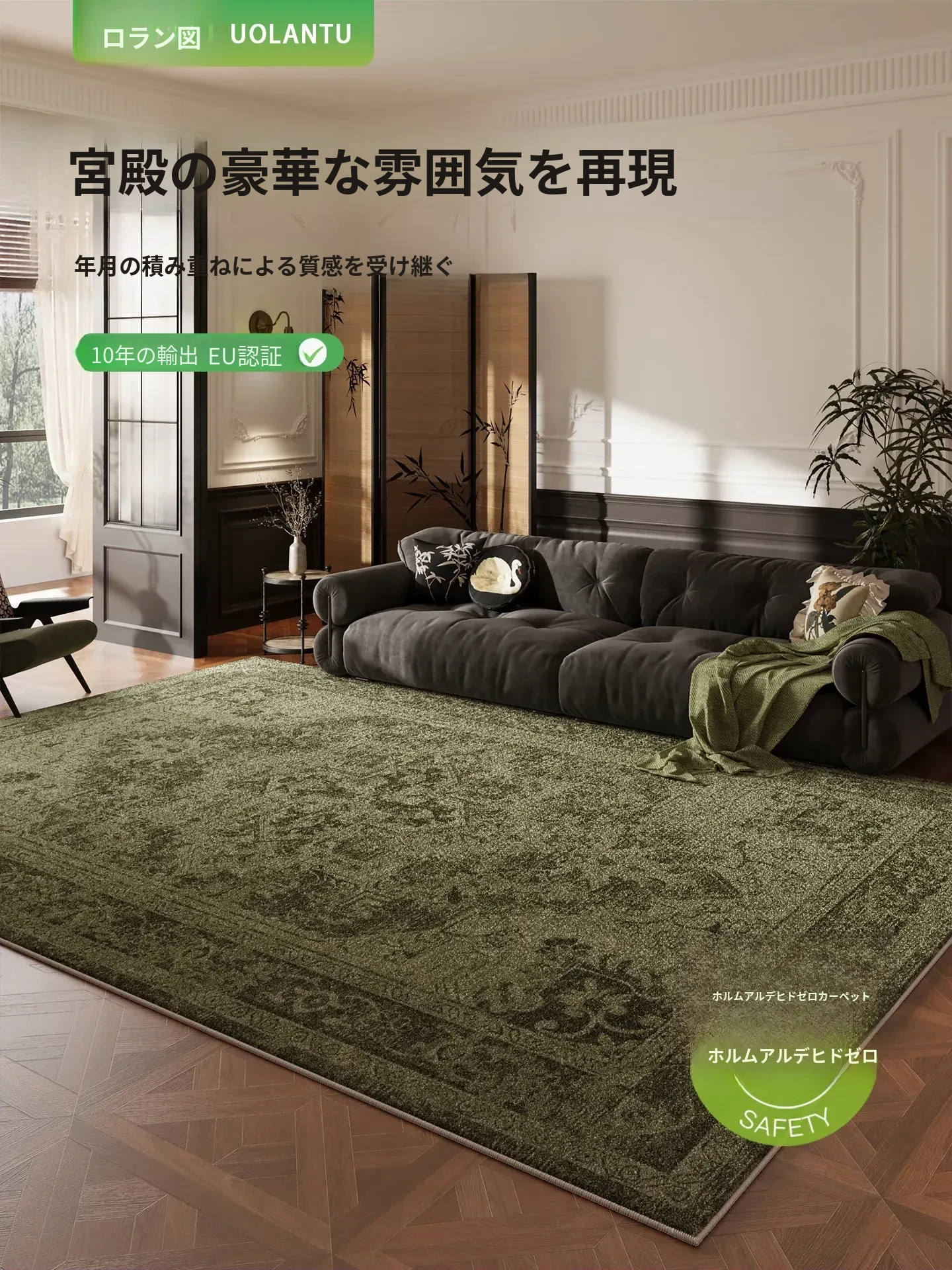 防水・お手入れ簡単!新作グリーンカーペット - 中古風デザインでリビングや寝室にぴったり。高級感溢れるライトラグで、快適な空間を演出します。