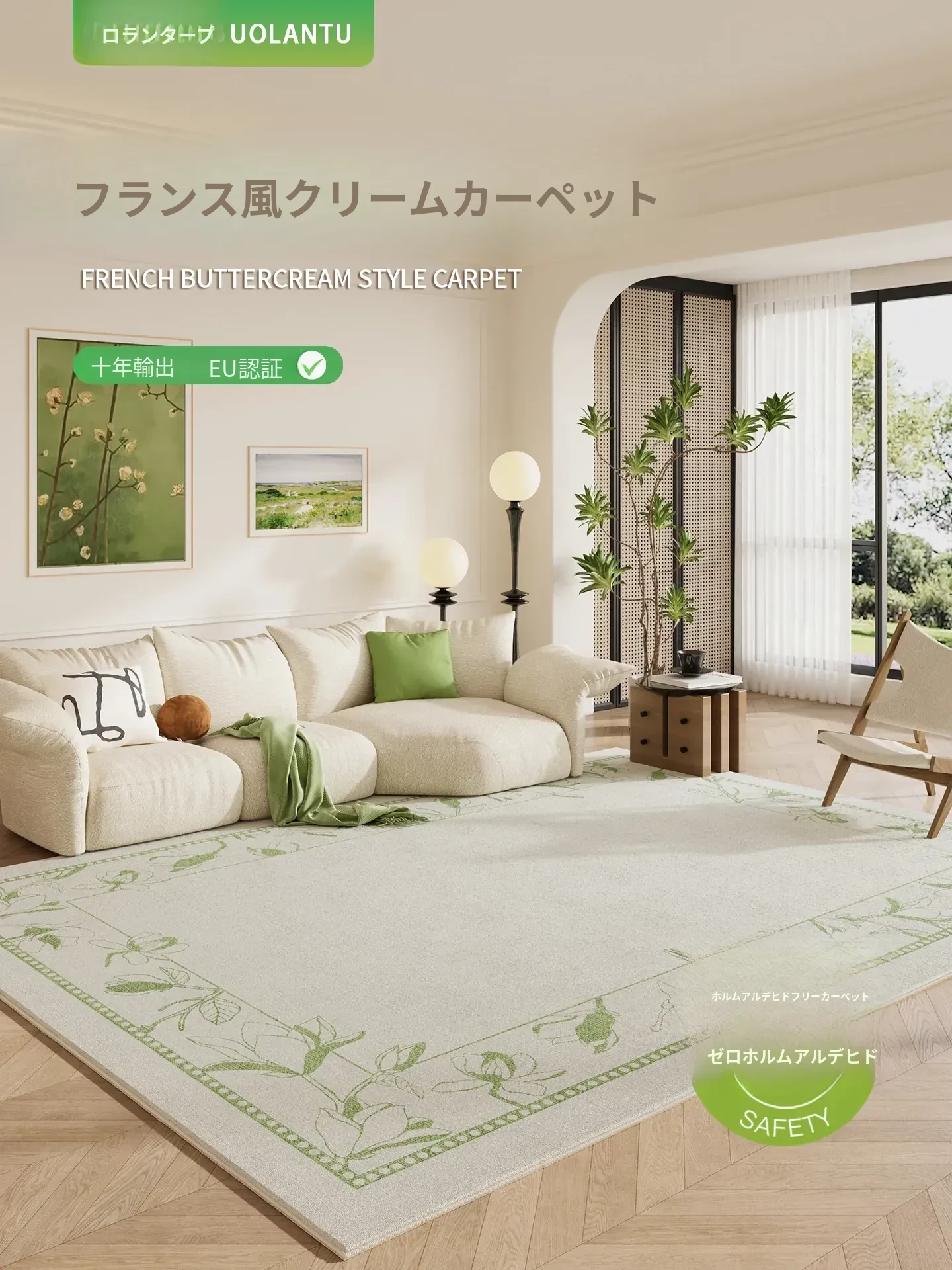 フランス風グリーンクリームラグ - リビングに最適!お手入れ不要、防水・汚れ防止でソファやテーブルの下にもぴったり。寝室のベッドサイドにも新しいデザインで、快適な空間を演出します!
