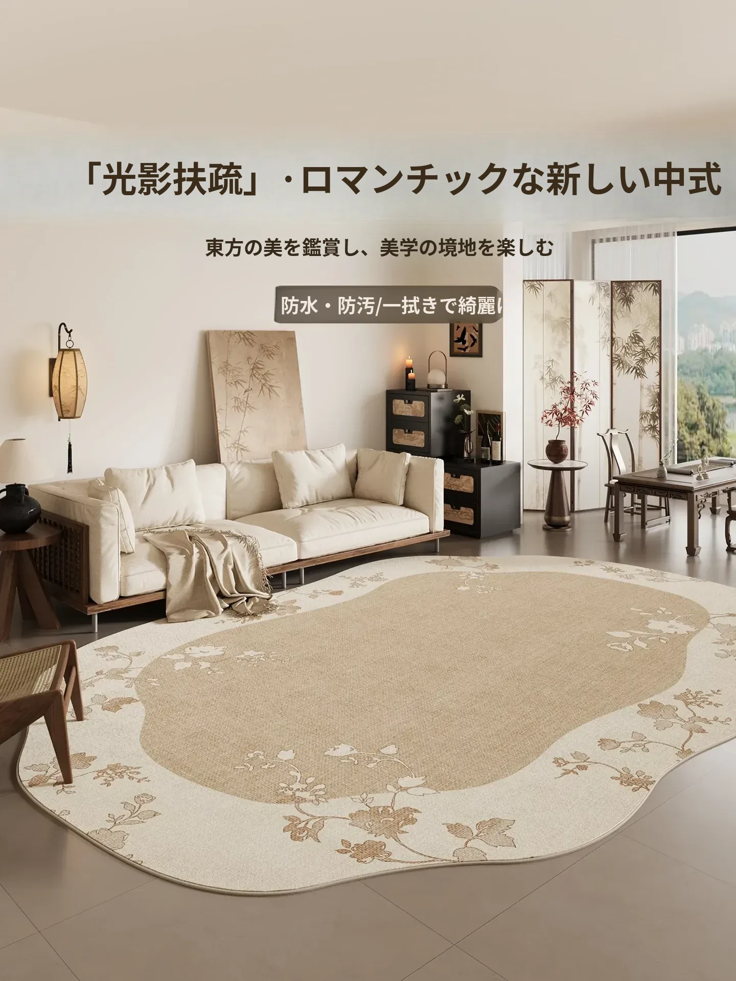 新中式風デザインのリネン風ラグ - お手入れ不要・防水・防汚!リビングやベッドサイドに最適な侘び寂びスタイルの新作マット。おしゃれなティーテーブルと一緒にどうぞ!